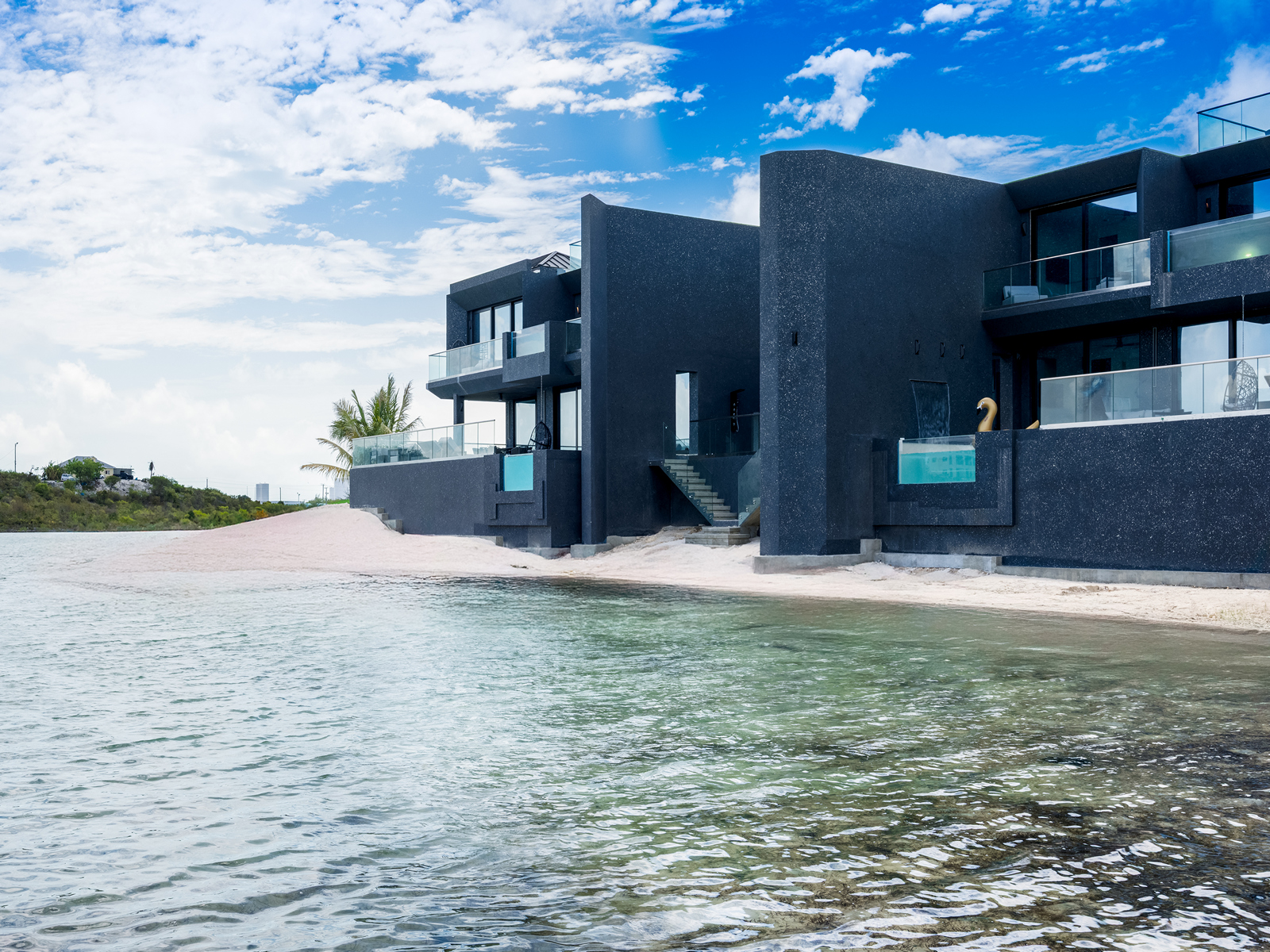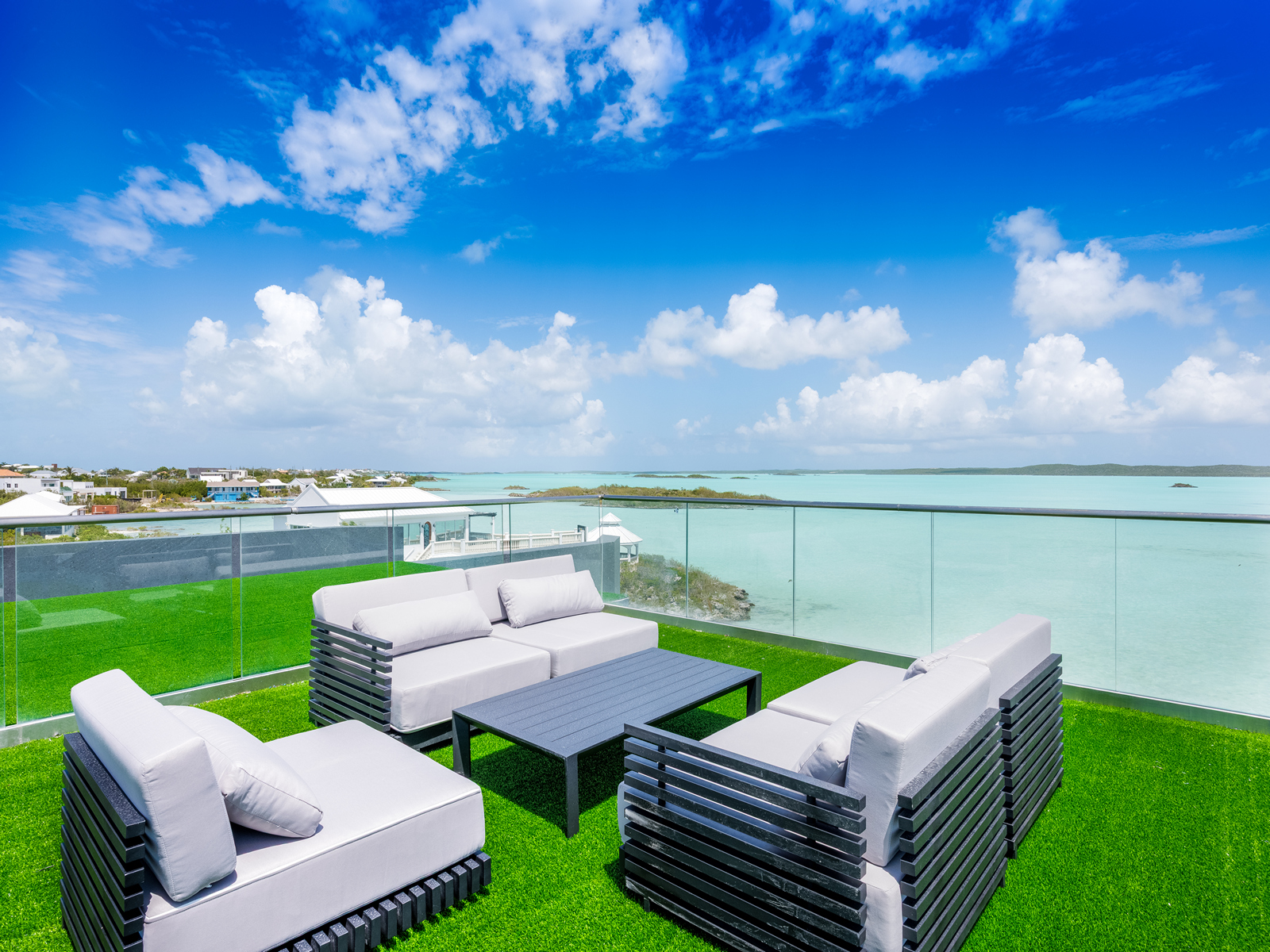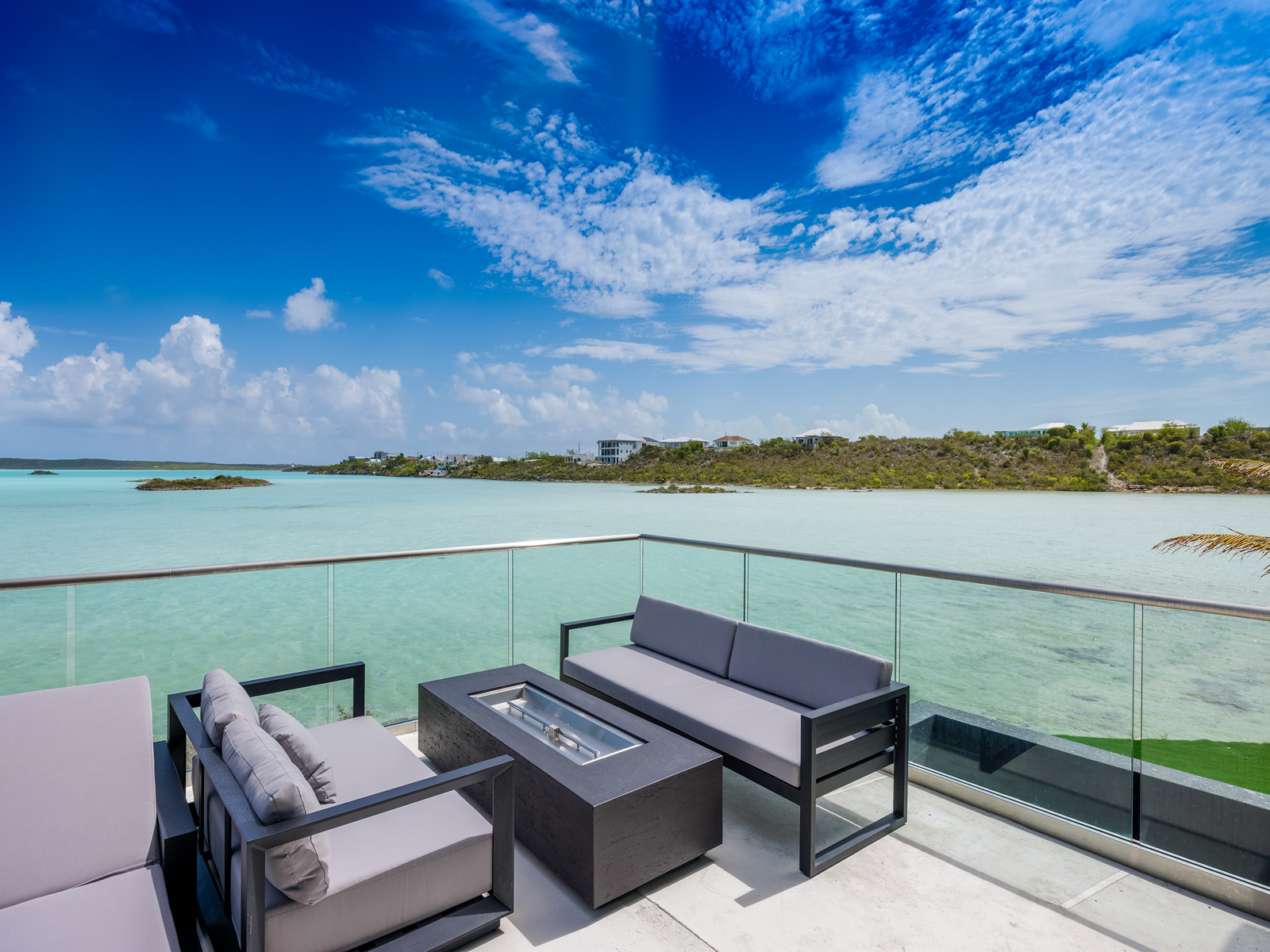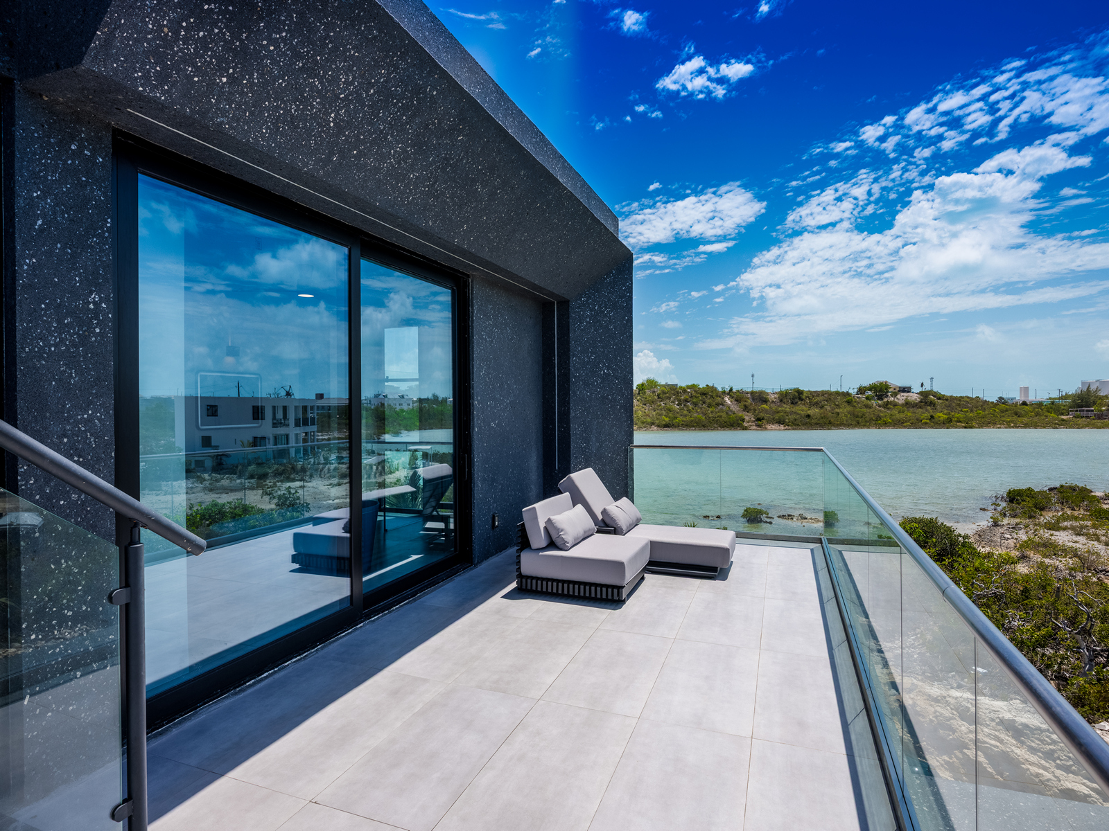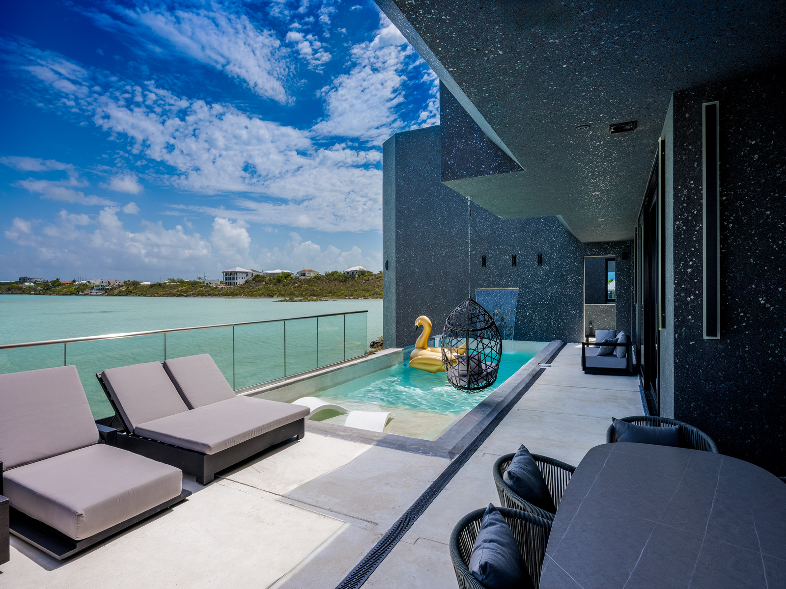 Direct Chalk Sound beachfront, 200m from Sapodilla Bay, and only 10 minutes (≈7 km) from the airport. Four ocean-view suites, including a master with dual balconies and a queen + queen bunk suite, sleep up to 10 guests. Chef’s kitchen with a stunning large island, Smart TVs, full laundry room, covered outdoor dining pavilion with seating for 10, and a massive 6-burner BBQ grill. Two glass-sided pools and a 360° rooftop deck with views of both oceans complete the scene. Grounds landscaped with coconut trees, palms, cacti, and lush turf.
