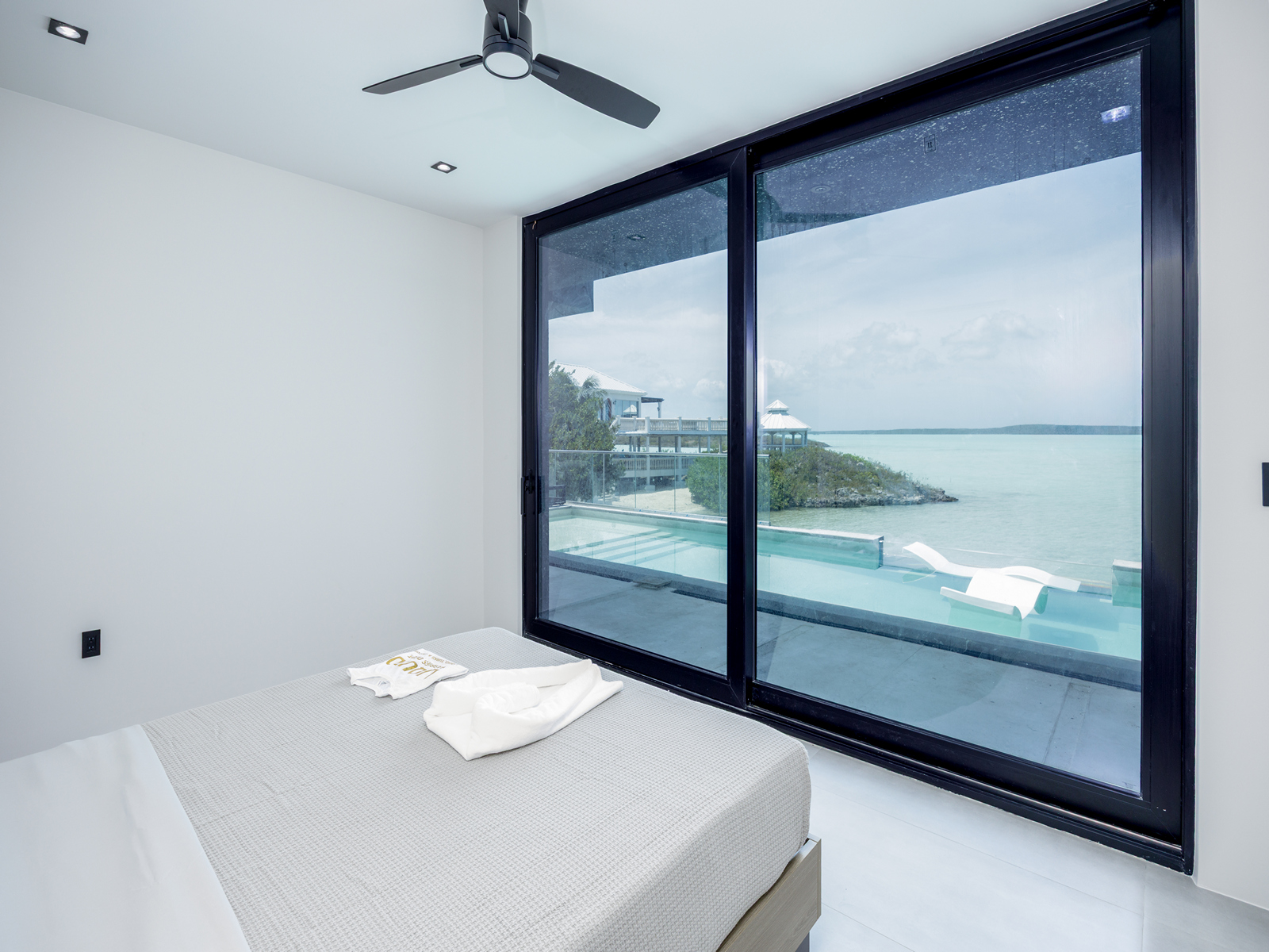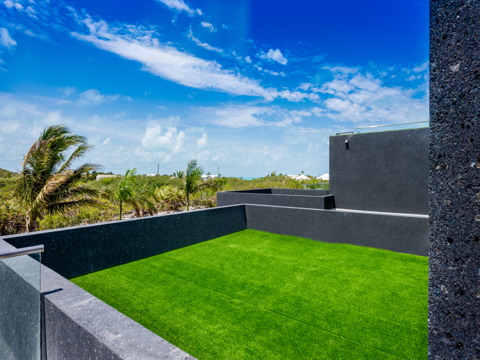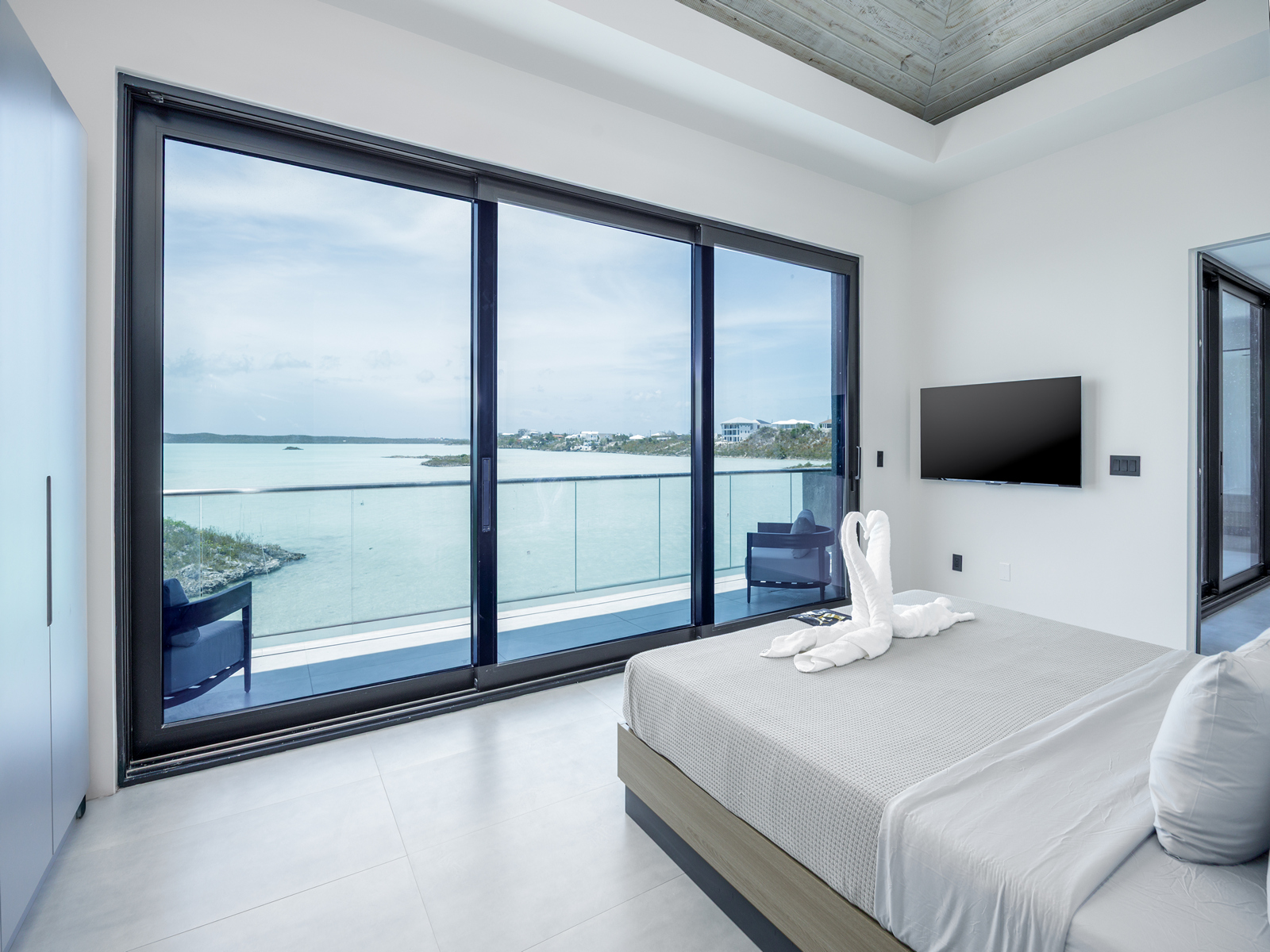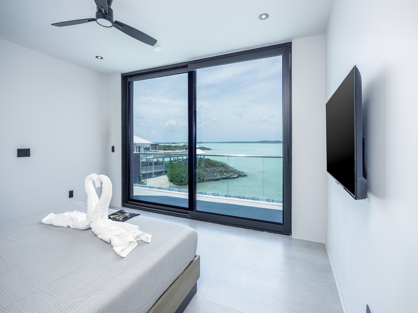 Direct Chalk Sound beachfront, 200m from Sapodilla Bay, and only 10 minutes (≈7 km) from the airport. Four ocean-view suites, including a master with dual balconies and a queen + queen bunk suite, sleep up to 10 guests. Chef’s kitchen with a stunning large island, Smart TVs, full laundry room, covered outdoor dining pavilion with seating for 10, and a massive 6-burner BBQ grill. Two glass-sided pools and a 360° rooftop deck with views of both oceans complete the scene. Grounds landscaped with coconut trees, palms, cacti, and lush turf.