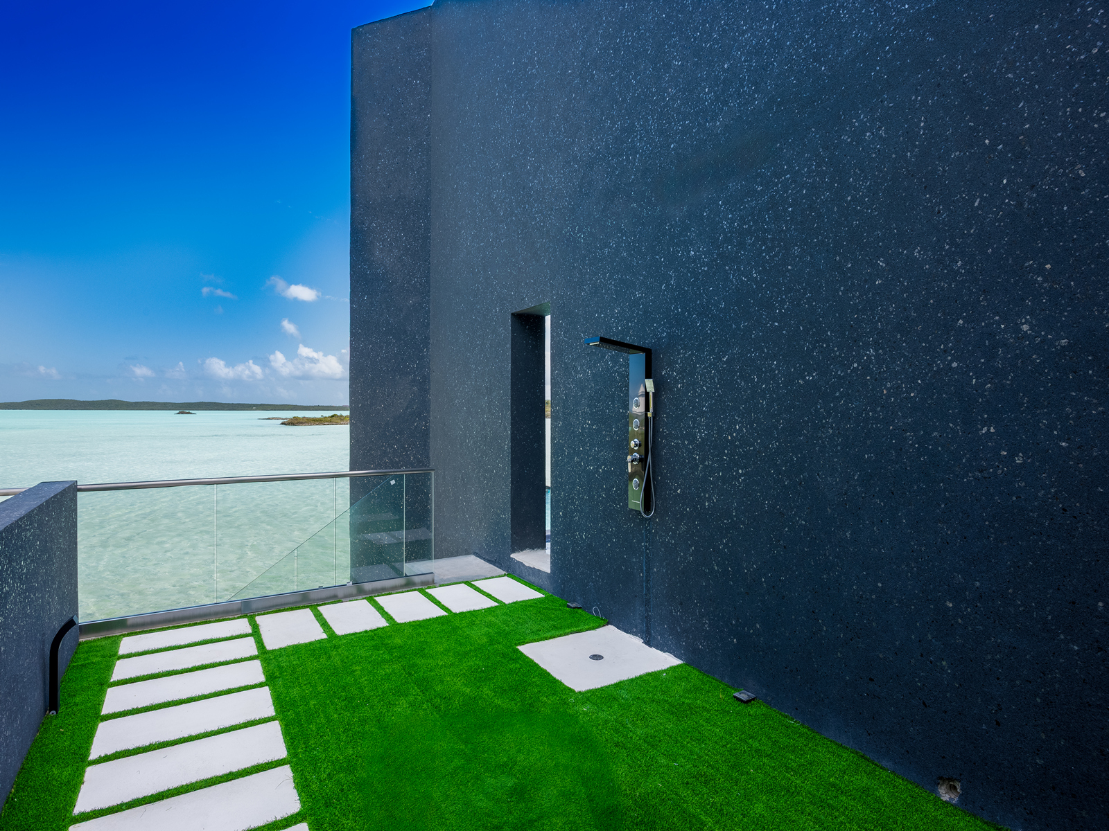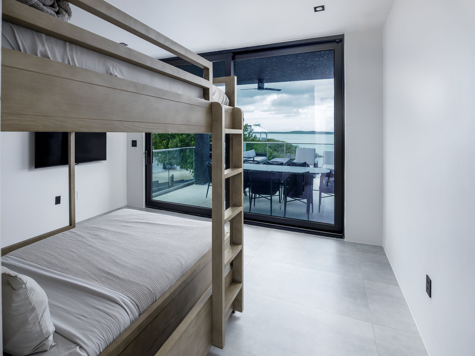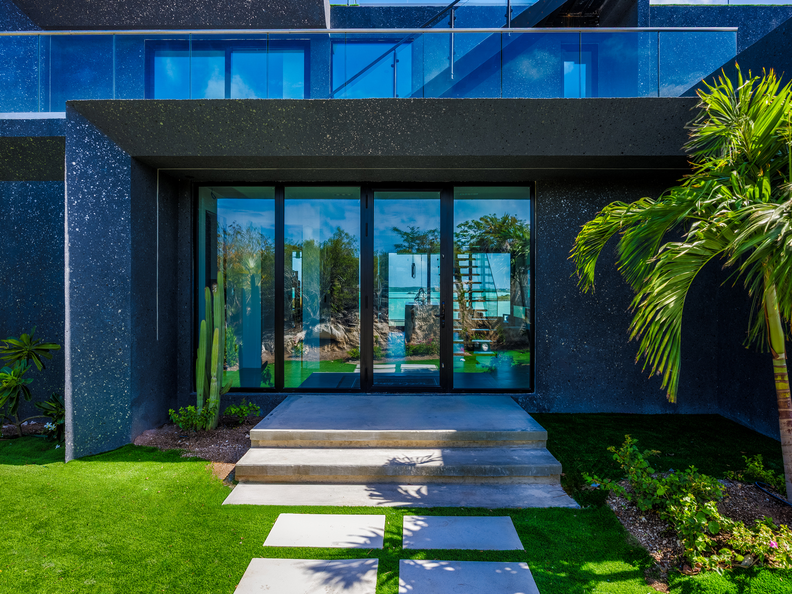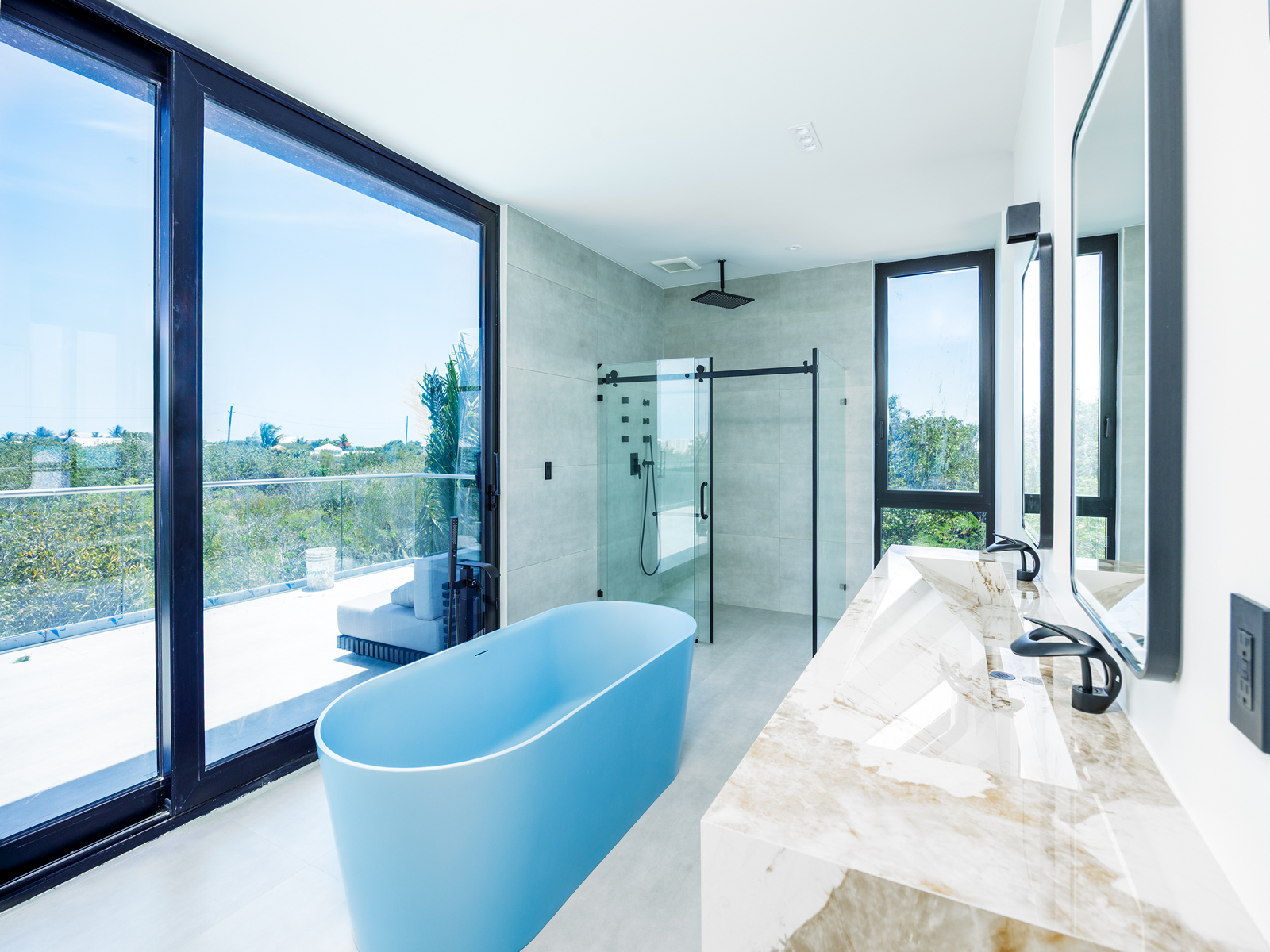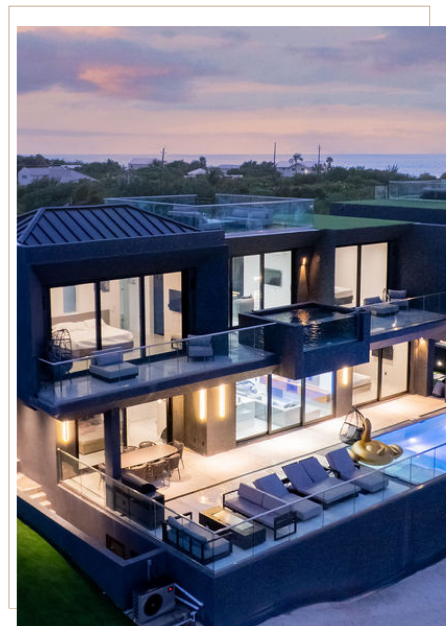 Direct Chalk Sound beachfront, 200m from Sapodilla Bay, and only 10 minutes (≈7 km) from the airport. Four ocean-view suites, including a master with dual balconies and a queen + queen bunk suite, sleep up to 10 guests. Chef’s kitchen with a stunning large island, Smart TVs, full laundry room, covered outdoor dining pavilion with seating for 10, and a massive 6-burner BBQ grill. Two glass-sided pools and a 360° rooftop deck with views of both oceans complete the scene. Grounds landscaped with coconut trees, palms, cacti, and lush turf.