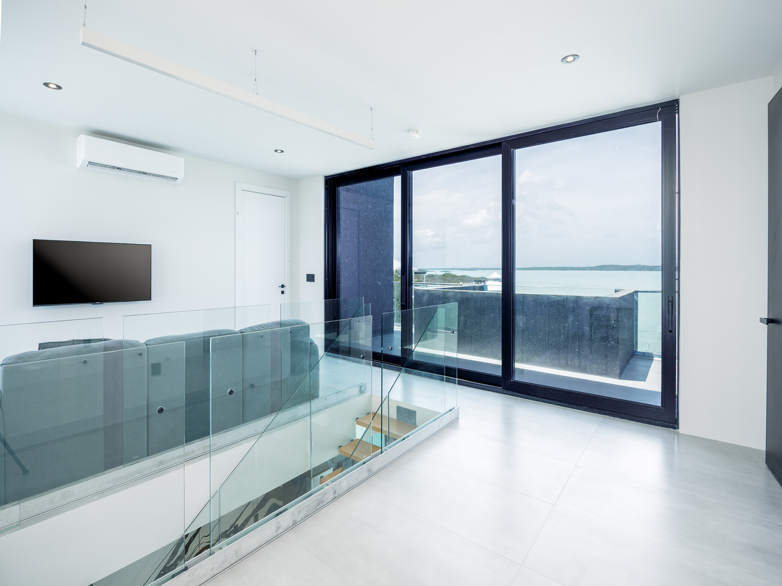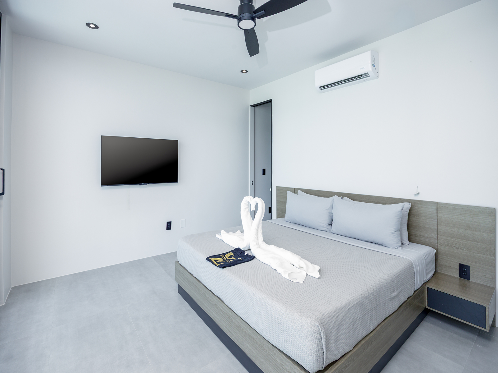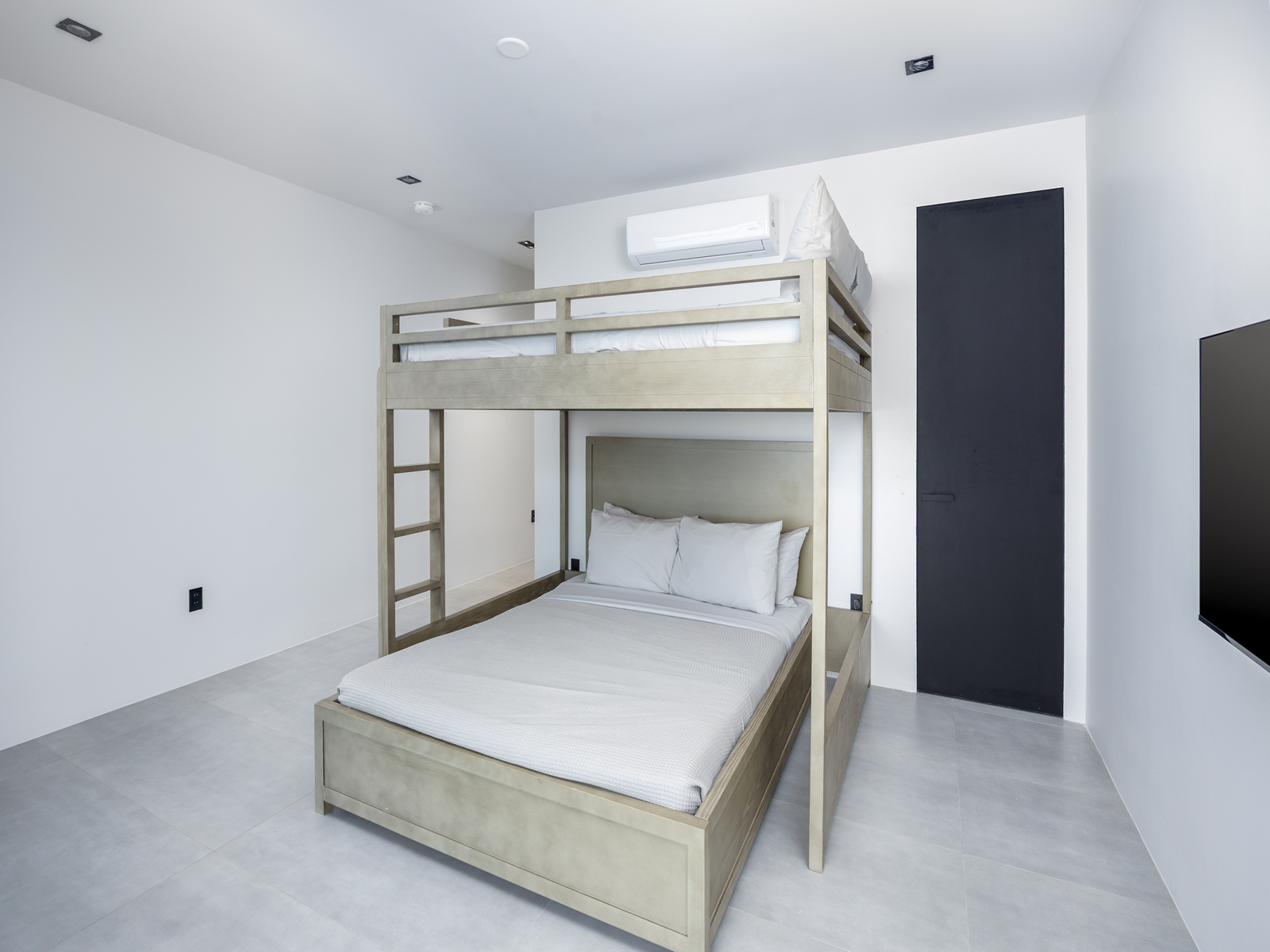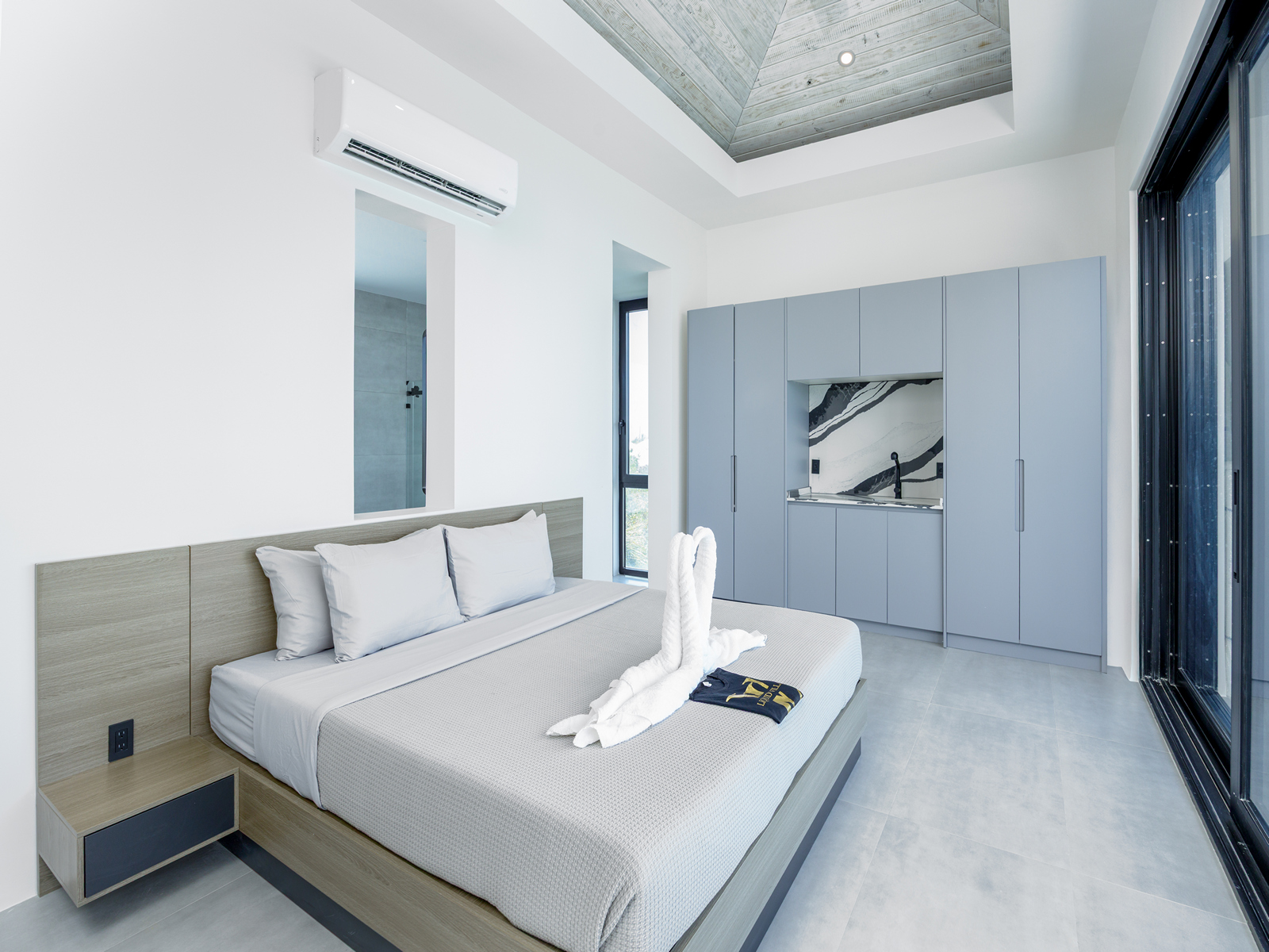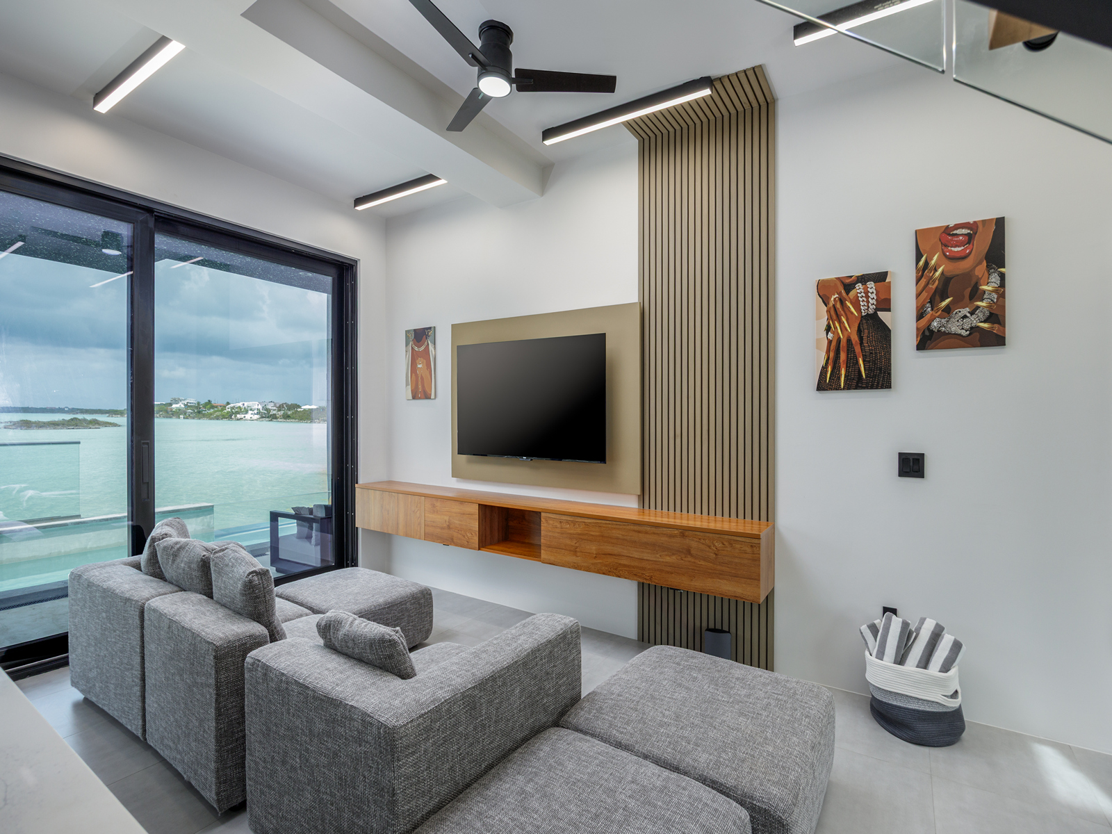 Direct Chalk Sound beachfront, 200m from Sapodilla Bay, and only 10 minutes (≈7 km) from the airport. Four ocean-view suites, including a master with dual balconies and a queen + queen bunk suite, sleep up to 10 guests. Chef’s kitchen with a stunning large island, Smart TVs, full laundry room, covered outdoor dining pavilion with seating for 10, and a massive 6-burner BBQ grill. Two glass-sided pools and a 360° rooftop deck with views of both oceans complete the scene. Grounds landscaped with coconut trees, palms, cacti, and lush turf.